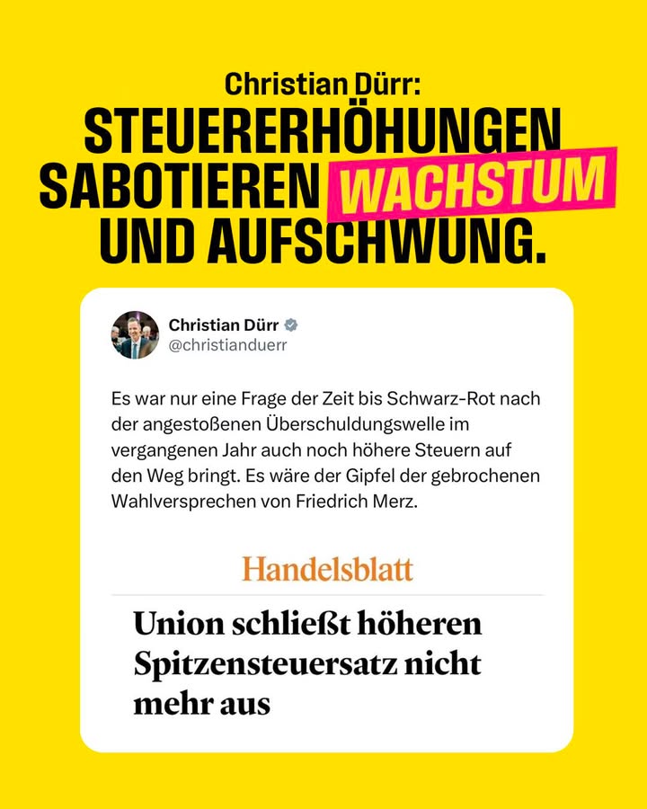 Deutschland hat eine riesige Stärke - und das ist unser Mittelstand. 💪Unternehmen, die Jobs und Innovation schaffen. Die Steuerpläne der SPD treffen nicht die Konzerne, sondern unsere Familienbetriebe, die in der Krise zu kämpfen haben. Die Erbschaftsteuer auf Werte, die in Betrieben investiert sind, gehört abgeschafft, fordert daher unser Bundesvorsitzender Christian Dürr.